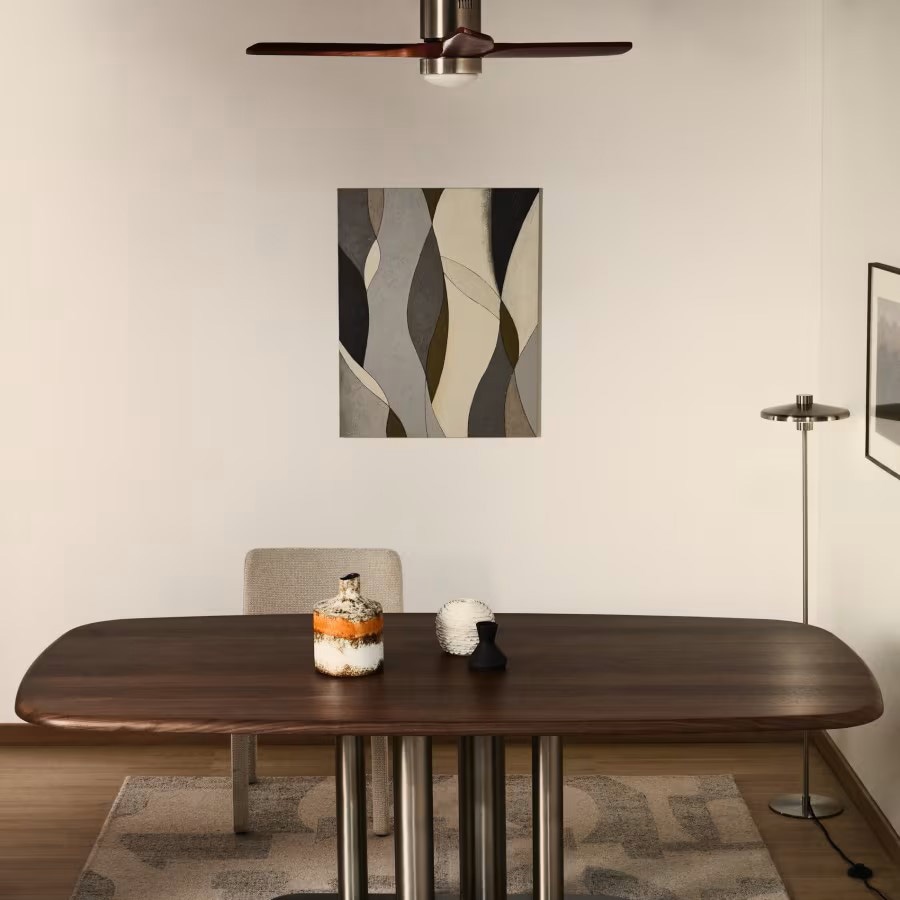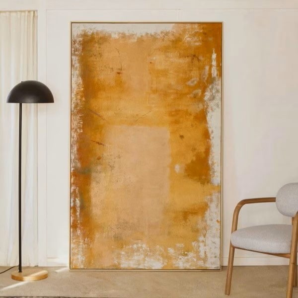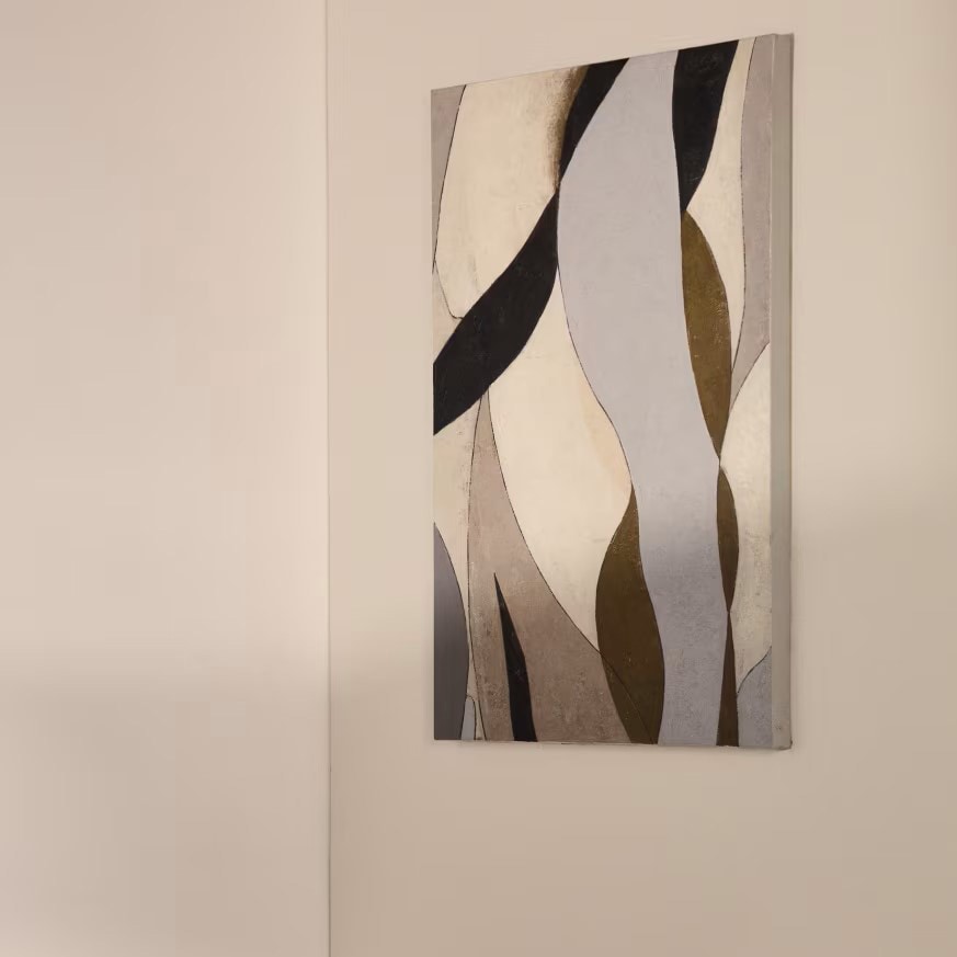 落ち着いたグレーに、マスタードのアクセントが映える一枚。流れるようなラインと自然なかたちが、空間をやさしく整えてくれます。モダンな空間に、静かな存在感を。