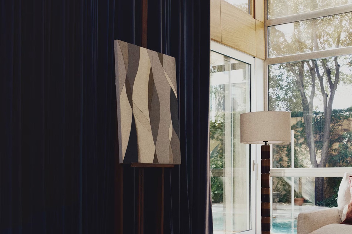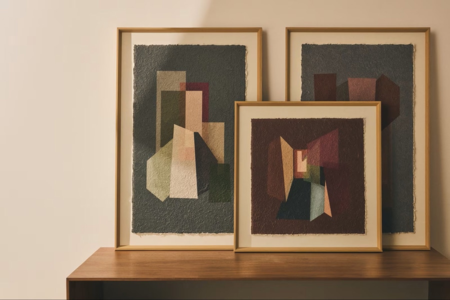 VELUNIコレクションは、幾何学的なかたちと色彩をバランスよく組み合わせたアート。再生紙のやさしい質感が、壁面にさりげない表情を加えます。暖色・寒色・ニュートラルカラーが調和し、リビングや寝室に落ち着いたアクセントを。