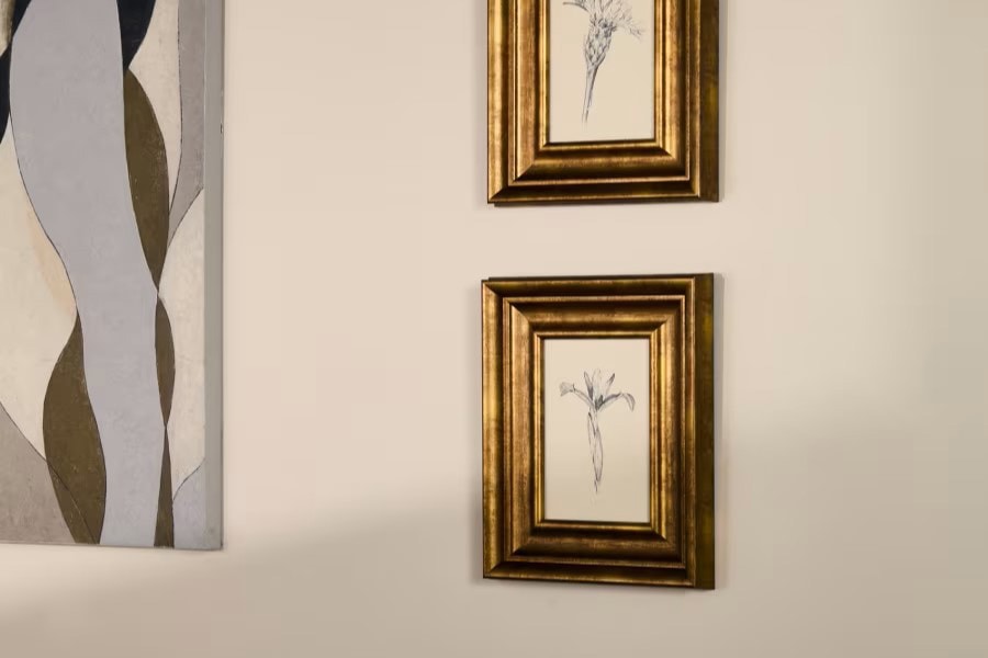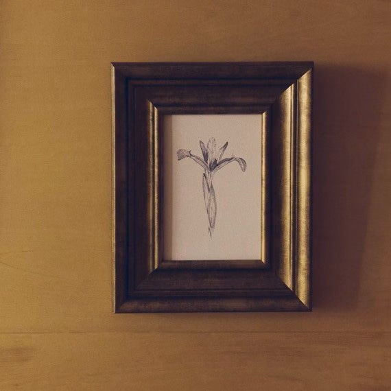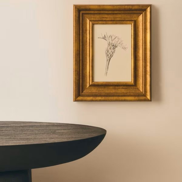 鉛筆で描かれたボタニカルモチーフが、やさしい雰囲気をつくるアート。繊細な花のラインが空間にそっとなじみ、アンティーク調ゴールドのフレームが、さりげないアクセントに。