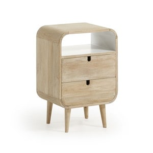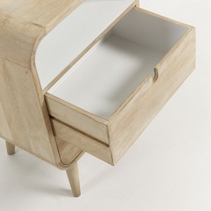 GERALDベッドサイドテーブル マンゴーの無垢材を使用し、細部にホワイトラッカーを施しています。 ちょっとした収納もあるので、便利かつ、デザインもまるいフォルムでかわいいです。